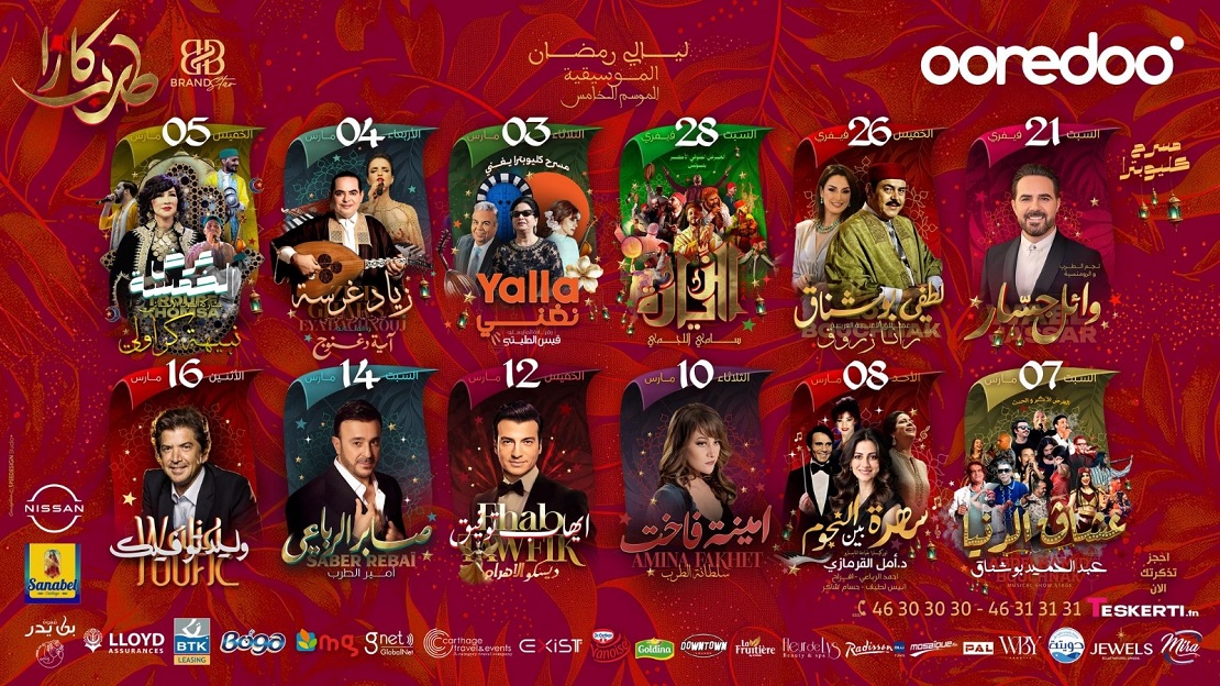 وتتواصل ليالي كازا طرب 2026 خلال النصف الثاني من شهر رمضان بسلسلة من السهرات الاستثنائية التي تجمع نخبة من أبرز نجوم تونس والعالم العربي، وفق البرنامج التالي: