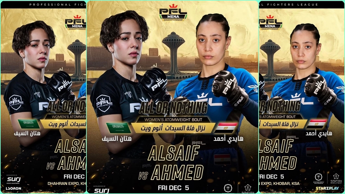 الخبر - تتجه الأنظار إلى مدينة الخبر بالمملكة العربية السعودية، حيث تستضيف منافسات النزالات النهائية لبطولة دوري المقاتلين المحترفين لمنطقة الشرق الأوسط وشمال أفريقيا (PFL MENA)، والتي تشهد مشاركة بارزة للمقاتلة المصرية هايدي أحمد، بطلة مصر في الملاكمة ست مرات، التي تستعد لمواجهة المقاتلة السعودية هتان السيف في أول ظهور احترافي لها في الفنون القتالية المختلطة.
