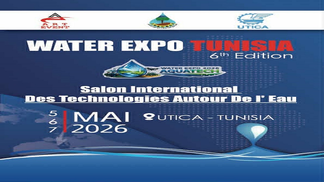 في قلب التغيرات المناخية تحت إشراف وزارة الفلاحة والموارد المائية والصيد البحري ، تنظّم شركة ART EVENT بالشراكة مع المعهد الوطني للبحوث في الهندسة الريفية والمياه والغابات INRGREF، فعاليات الدورة السادسة من الصالون الدولي للأنشطة والتكنولوجيات المائية “WATER EXPO TUNISIA 6.0”، وذلك أيام 05 و06 و07 ماي 2026 بمقرّ الاتحاد التونسي للصناعة والتجارة والصناعات التقليدية UTICA.