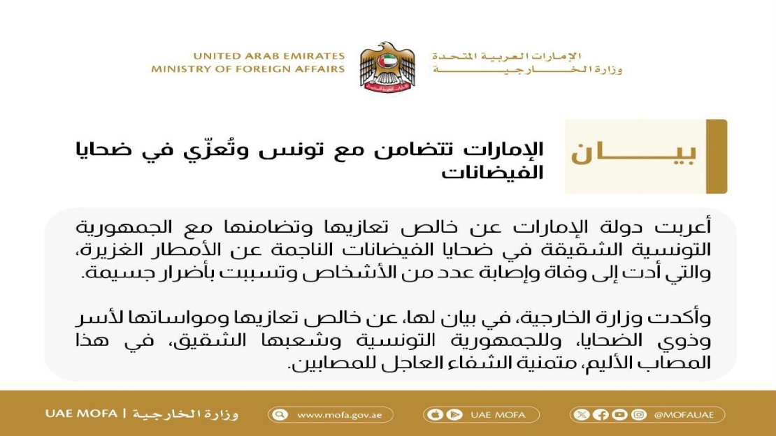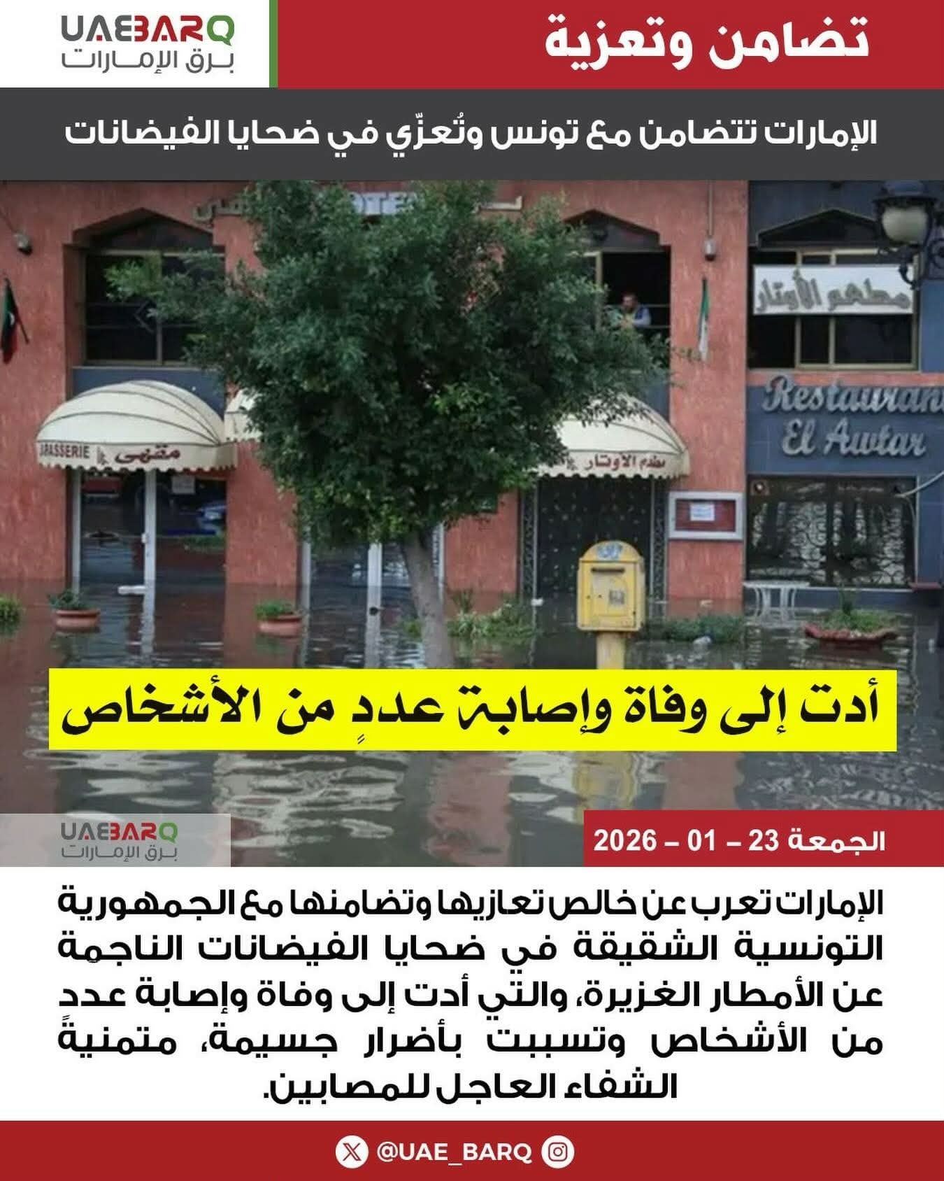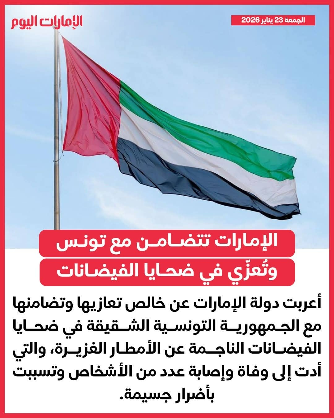 التضامن مع الدولة التونسية والشعب التونسي ليس بجديد عن دولة الإمارات الصديقة فقد اعربت عن خالص تعازيها وتضامنها مع الجمهورية التونسية في ضحايا الفيضانات الناجمة عن الأمطار الغزيرة، والتي أدت إلى وفاة وإصابة عدد من الأشخاص وتسببت بأضرار جسيمة، متمنيةً الشفاء العاجل للمصابين.